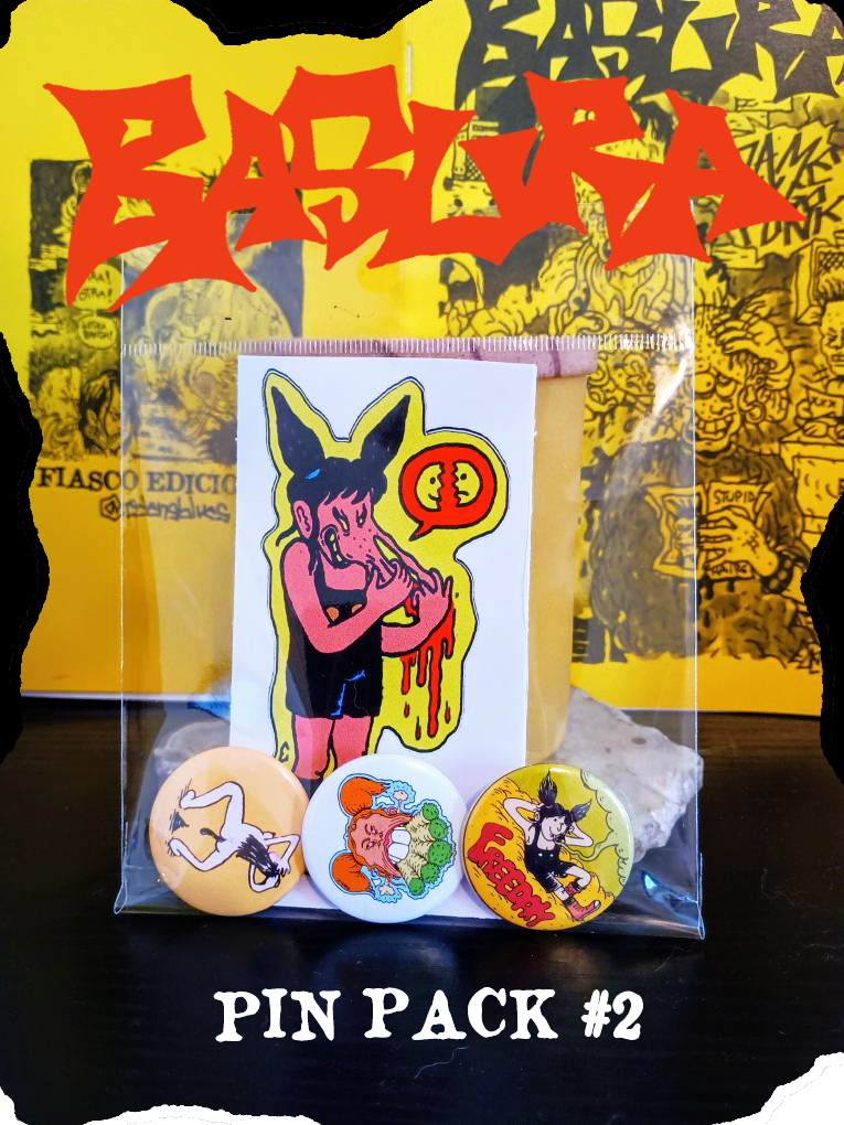 Pack of 3 pins plus a free Basura/Freedah sticker. Artwork by Edén D.